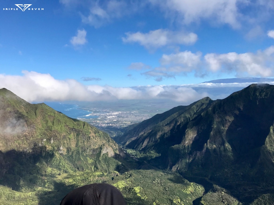 At first, the valley was eerily quiet, then came the rush of waterfalls, chirping birds, and rushing rivers below. It was so thick and tropical, yet imposing with its chiseled rock face starkly contrasting against the green backdrop. It reminded him of the Green Wall in Pokara, Nepal – another challenging flight that he struggled to accomplish. He remained along the rock face as long as he could, but it quickly dropped back and he didn’t dare follow. He knew that the trade winds were going to be strongest along the upcoming ridge he needed to cross. In fact, the path to the Waihe’e Coast would require him to cross a half-dozen mountain ridges, upwind. He chose the middle of the valley, knowing that this was the area that would likely have the least rotor, but likely the most sink. He was trying to err on the side of caution and not risk a collapse too deep in the valley to survive. He carefully pulled out his iPhone from his flight deck and snapped a few quick photos before stuffing it back to safety. His body was rigid as a log as he tried to better his glide ratio. He eked out an extra few points on his vario and worked out where he would need to be to make his first crossing out of the valley.